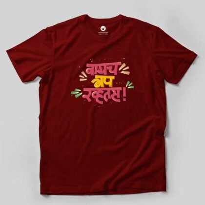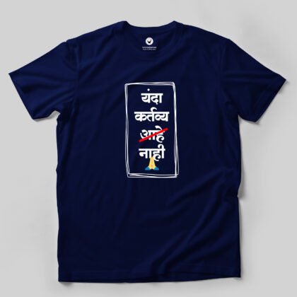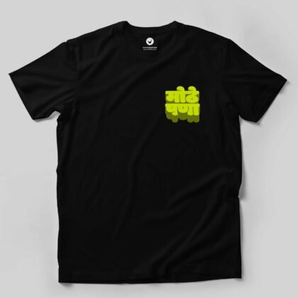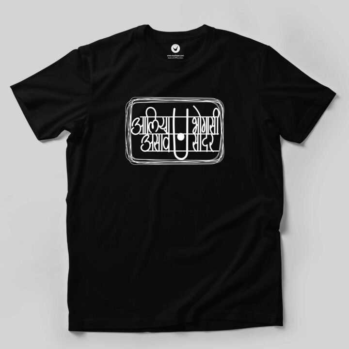Aliya bhogasi asave sadara (आलीय भोगासी असावे सादर). Marathi unisex T-shirt. Crafted from 180GSM Cotton with a round neck, pre-shrunk, bio-washed, and with half sleeves. Available in Black, Blue, Yellow, and Red colors.