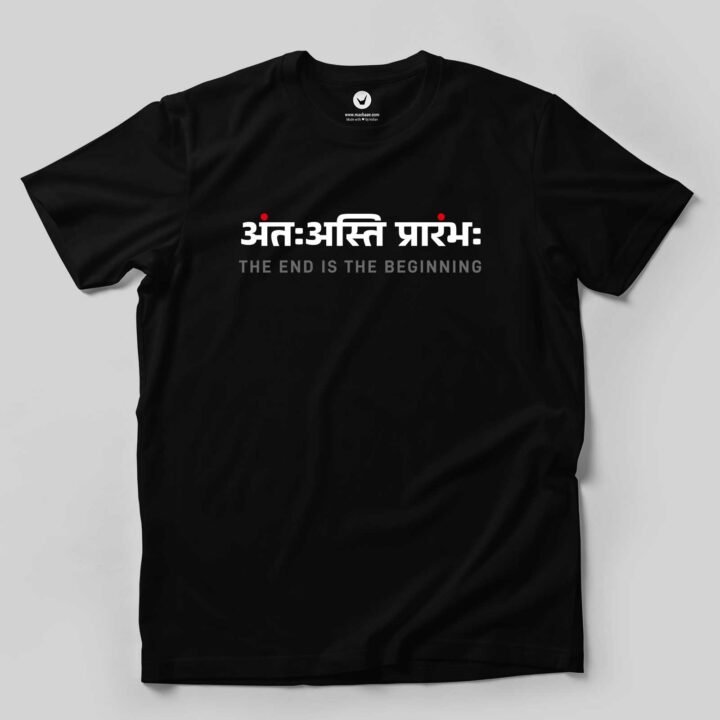 Antah Asti Prarambh – The end is the beginning. Sanskrit printed unisex T-shirt. Crafted from 180GSM Cotton with a round neck, pre-shrunk, bio-washed, and with half sleeves. Available in White, Black, and Blue colors.