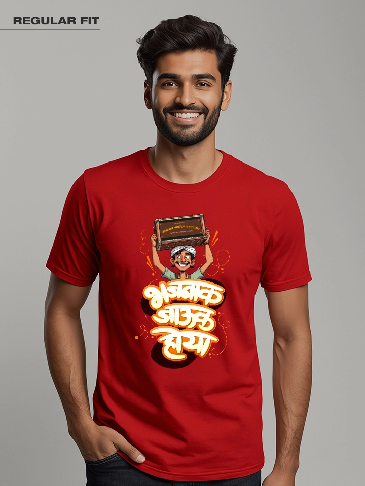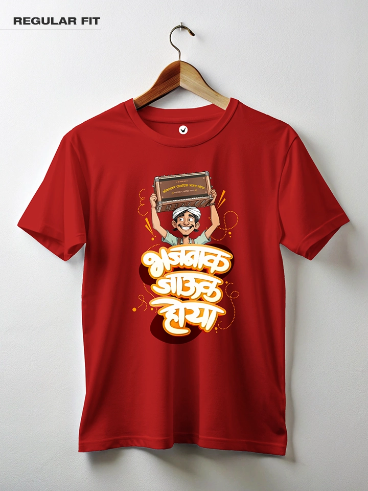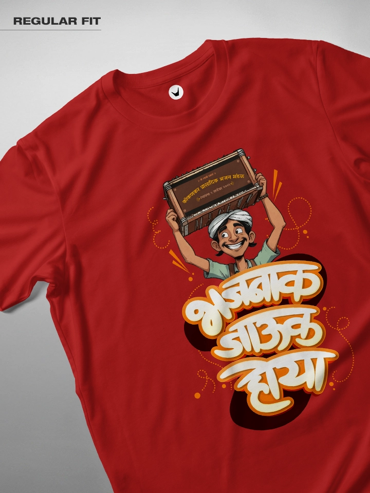 Celebrate Ganeshutsav with our special edition t-shirt, designed for true bhajan lovers. Marathi Printed Unisex Malvani-Marathi T-shirt. Crafted from 180GSM Cotton with a round neck, pre-shrunk, bio-washed, and with half sleeves. Available in Black, Blue, Red, and White Color.