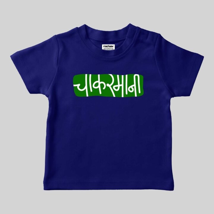 Chakarmani -Marathi Printed Unisex Kids T-shirt Crafted from 180GSM Cotton with a round neck, pre-shrunk, bio-washed, and with half sleeves. Available in White and Royal Blue colors .