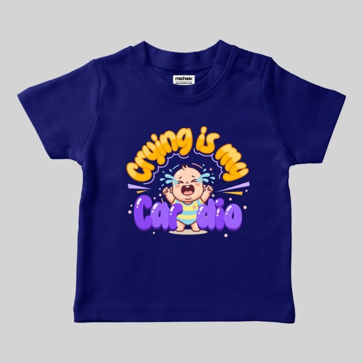 Crying is my cardio Printed Unisex Kids T-shirt Crafted from 180GSM Cotton with a round neck, pre-shrunk, bio-washed, and with half sleeves. Available in White and Blue colors.