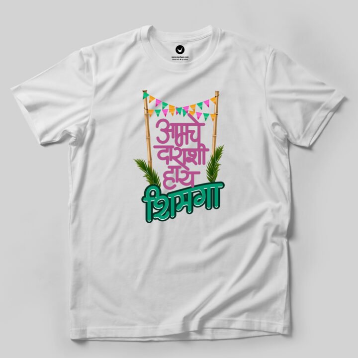 Celebrate Shimga (Holi) with our special edition t-shirt. Marathi Printed Unisex T-shirt for Shimga Crafted from 180GSM Cotton with a round neck, pre-shrunk, bio-washed, and with half sleeves. Available in Maroon, Blue, and White Color.