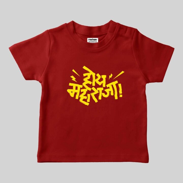 Hoy Maharaja -Marathi Printed Unisex Kids T-shirt Crafted from 180GSM Cotton with a round neck, pre-shrunk, bio-washed, and with half sleeves. Available in White, Royal Blue, Green and Red colors.