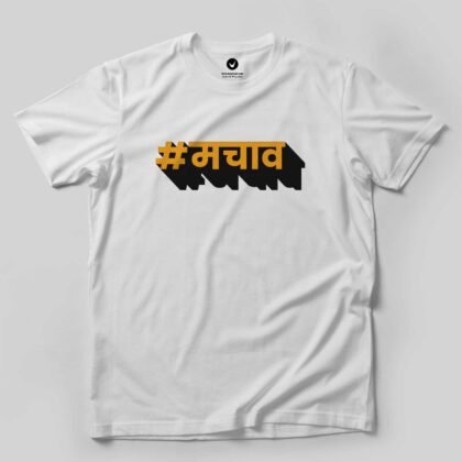 HoyMaharaja! (होय महाराजा!) Malvani unisex T-shirt. Crafted from 180GSM Cotton with a round neck, pre-shrunk, bio-washed, and with half sleeves. Available in Blue, Red, Yellow, and White colors.