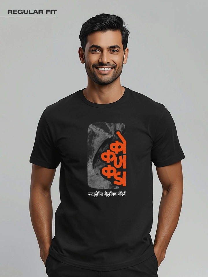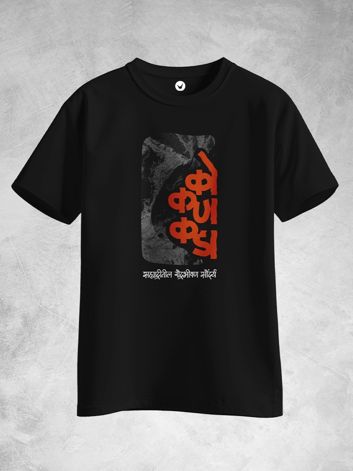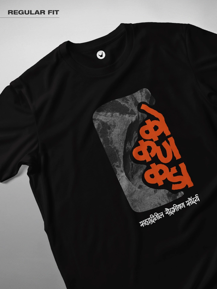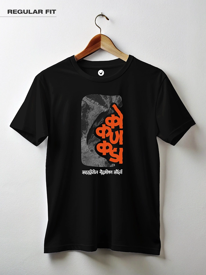 Kokankada-Sahyadritil Raudra Bhishan Saundrya. Marathi Printed Unisex T-shirt Crafted from 180GSM Cotton with a round neck, pre-shrunk, bio-washed, and with half sleeves.