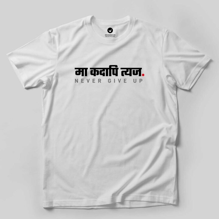 Ma Kadapi tyaja – Never Give Up. Sanskrit printed unisex T-shirt. Crafted from 180GSM Cotton with a round neck, pre-shrunk, bio-washed, and with half sleeves. Available in White, Black, and Blue colors.