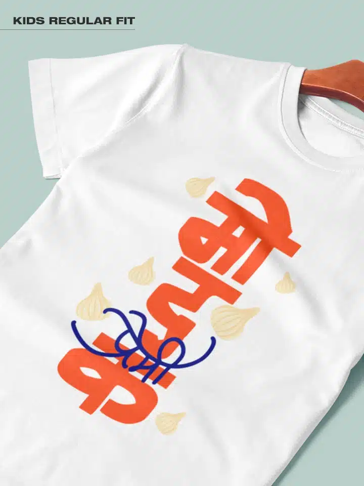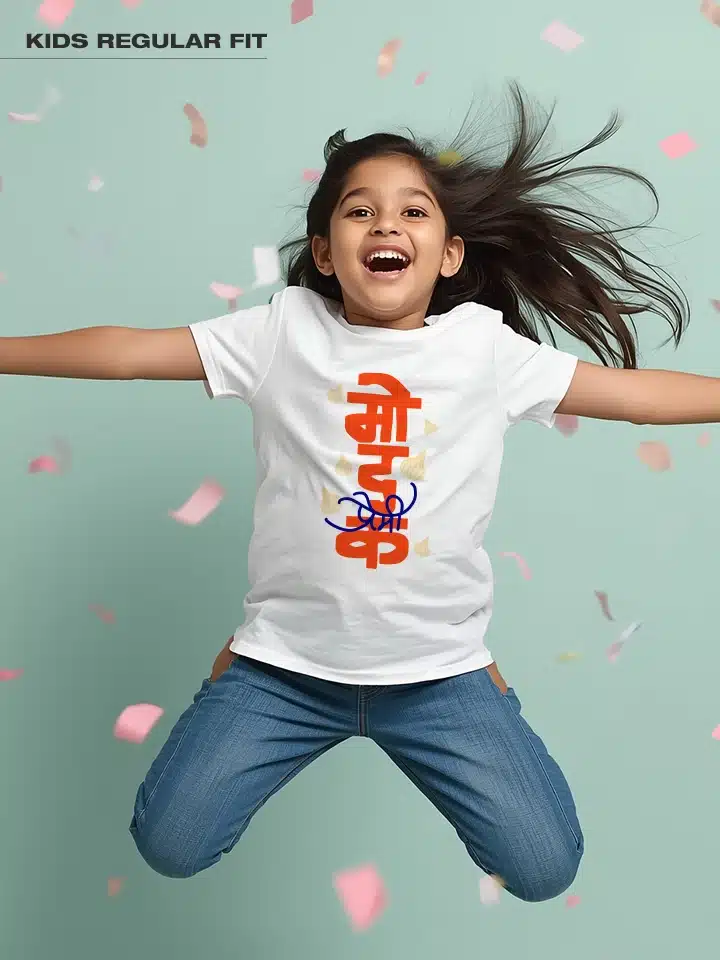 Modak Premi -Marathi Printed Unisex Kids T-shirt Crafted from 180GSM Cotton with a round neck, pre-shrunk, bio-washed, and with half sleeves.