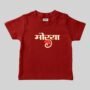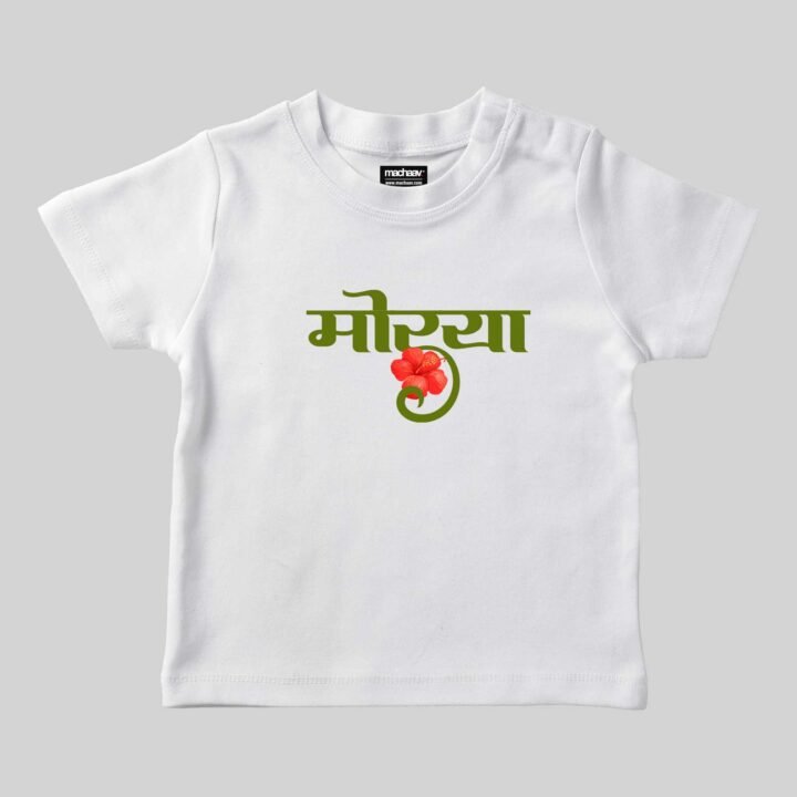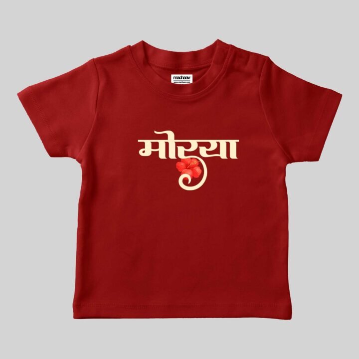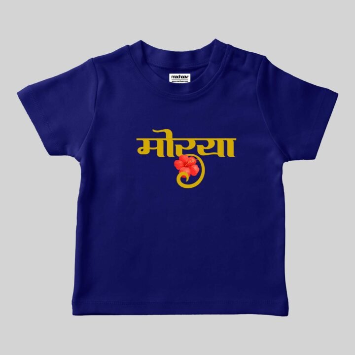 Morya-Marathi Printed Unisex Kids T-shirt Crafted from 180GSM Cotton with a round neck, pre-shrunk, bio-washed, and with half sleeves. Available in  Royal Blue, Green,White and Red colors.