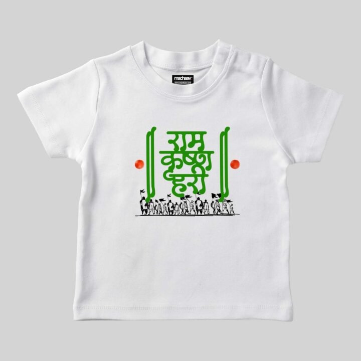 Ram Krishna Hari -Marathi Printed Unisex Kids T-shirt Crafted from 180GSM Cotton with a round neck, pre-shrunk, bio-washed, and with half sleeves. Available in White, Royal Blue and Red colors.