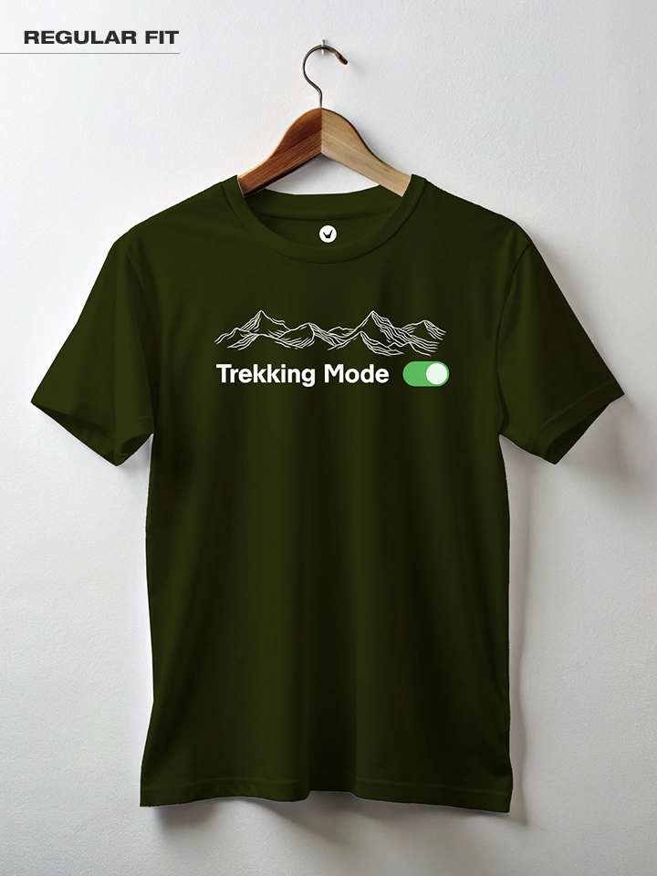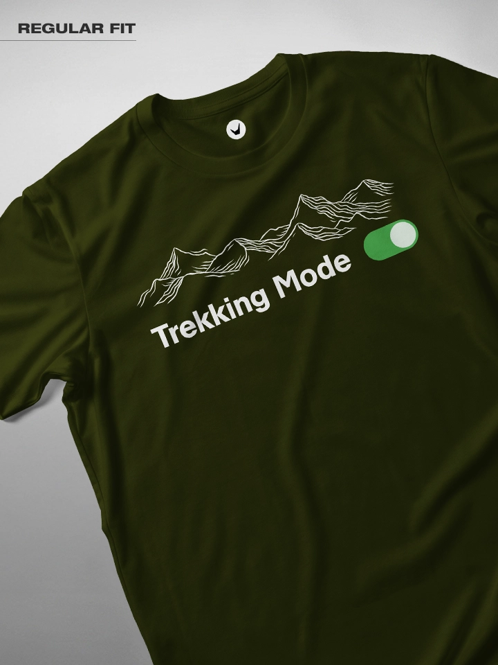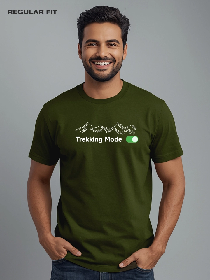 Trekking Mode – ON. Marathi Printed Unisex T-shirt Crafted from 180GSM Cotton with a round neck, pre-shrunk, bio-washed, and with half sleeves.